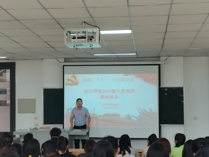 为进一步加强党员理想信念教育,强化党员的政治担当。在七一前夕,会计学院在博学楼115教室举行2022上半年新入党党员集体谈话活动,院党总支书记陈建平对新入党党员进行了集体谈话,活动由党务秘书张瑞老师主持。