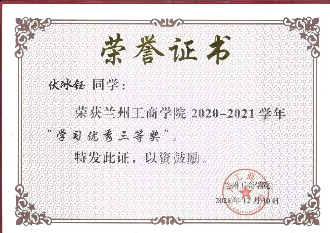 6.2021年12月,荣获兰州工商学院“2020-2021学年三好学生奖”;