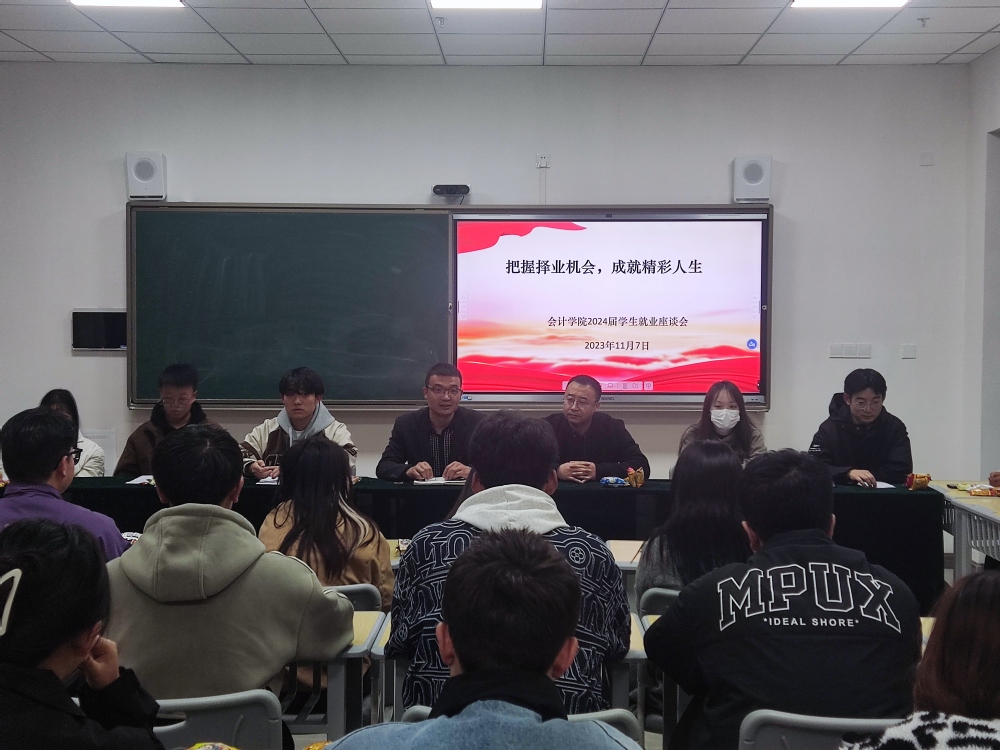 在学校双选会来临之际,为了给毕业生提振自信、打消顾虑,鼓励毕业生积极参加我校双选会,会计学院组织召开了“把握择业机会,成就精彩人生”为主题的毕业生就业座谈会。参加座谈会的有会计学院行政院长何成洋、会计学院党委书记姚建刚和毕业班辅导员张晓霞老师以及2024届毕业生中的党员、班委、宿舍长。