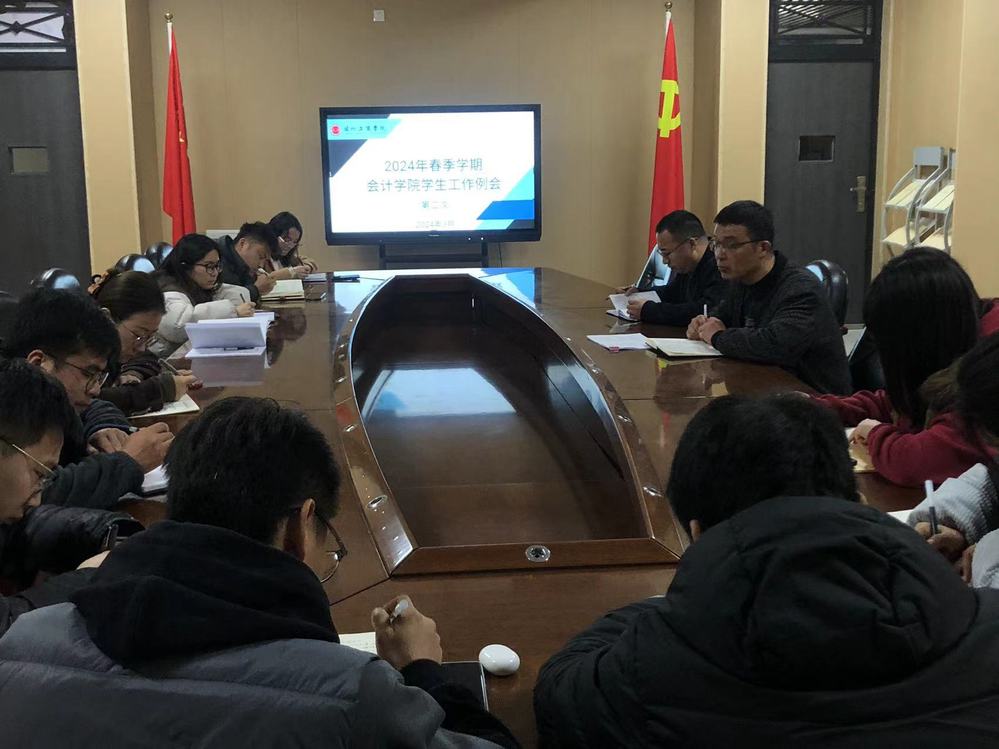 2024年3月14日下午,会计学院在综合教学楼C112会议室组织召开本学期第二次学生管理工作会议,学院行政院长何成洋、党委书记姚建刚、行政院长助理王亚超以及全体辅导员参加本次会议。