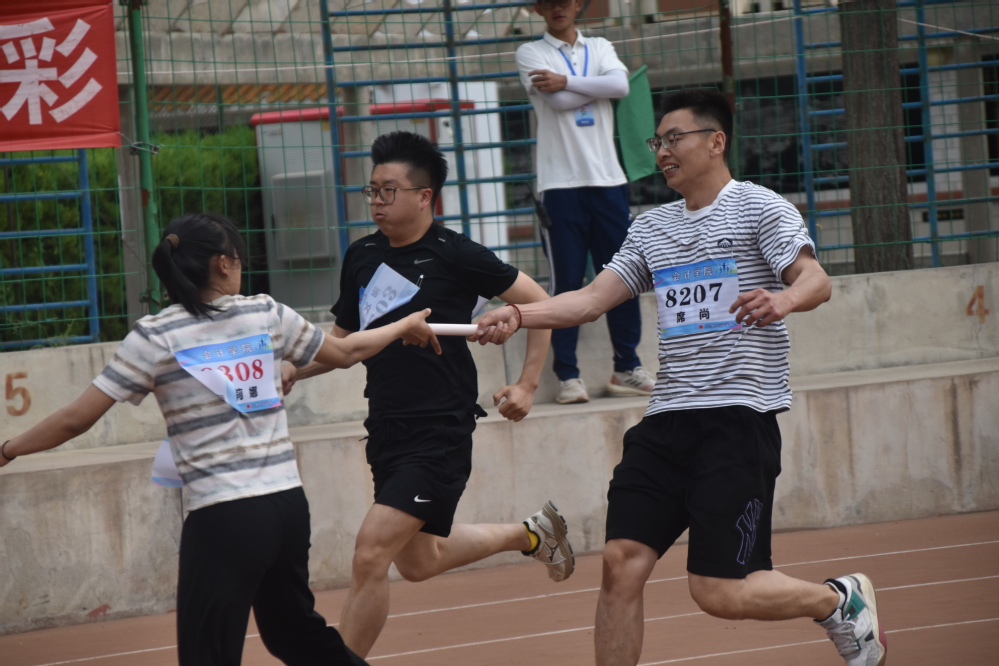 本届运动会中,我院师生奋勇拼搏、众志成城,在比赛中展现出了永不言弃、不屈不挠的精神,取得了优异的成绩。我院学生团体总分855分,教工团体总分109分,两项分值均遥遥领先。其中,会计学2202班郑菊同学表现出色,接连打破100米、200米的校记录;在女子跳高项目中,会计学(管理会计)方向2201班陈敏芮同学以 1.36米的优异成绩打破学校纪录;学生组男子4×100米、男子 4×400 米和女子 4×100 米接力项目均打破校纪录;教工女子组400米、男子组跳远、男子组200米、男女混合接力4×100米等项目取得了第一名的优异成绩。