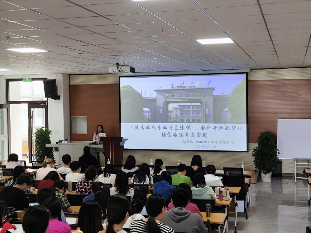 5月24日下午,在综合教学楼C503教室举办了首届学术活动月的第三场学术报告,由西北师范大学会计系主任赵雪梅教授做了题为“一流专业及专业特色建设——会计专业数智化转型的思考与实践”的学术报告。学校教师和学生代表共近200人参加,报告由会计学院教学院长李菊香教授主持。