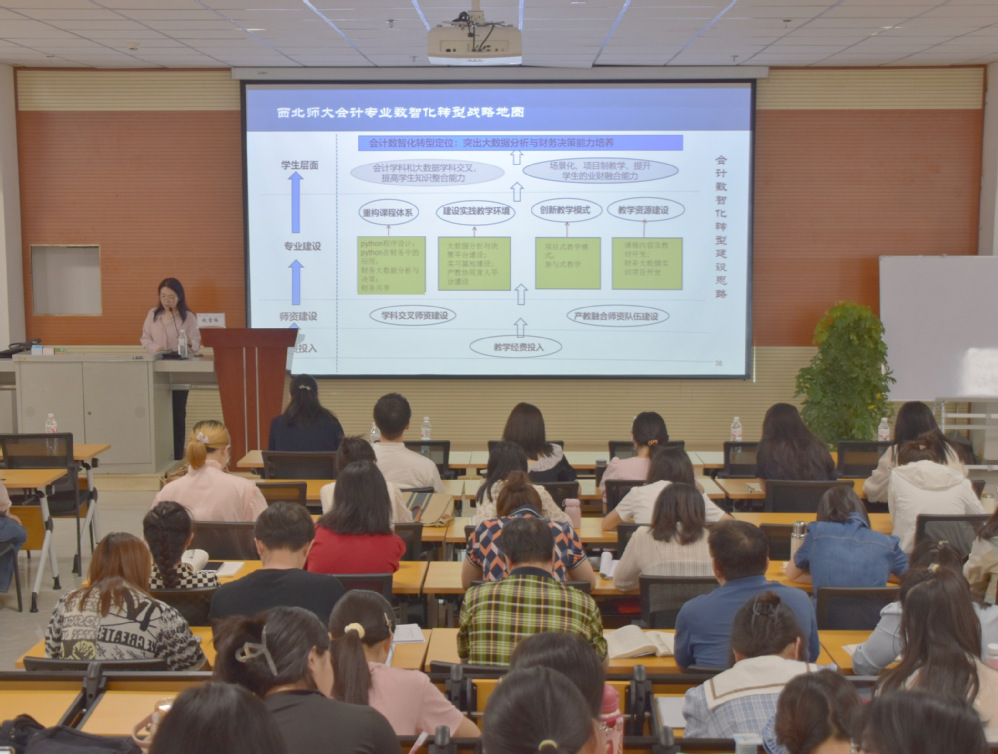 赵雪梅教授主要从“一流专业建设”和“专业特色建设”两个方面展开阐述。针对一流专业建设赵雪梅教授围绕《国标》指导专业建设、构建专业特色、争取更多的标志成果、探索课程思政的方式、重视专创融合的改革、迎接数智时代挑战六个方面阐释了如何建设一流专业。接着她以西北师范大学会计专业数智化建设为例从新一代信息技术与企业数字化、数智技术与会计数智化转型以及重构会计人才培养体系三个方面分析了会计专业数智化建设思路与实践,使参会的各专业老师受益匪浅。