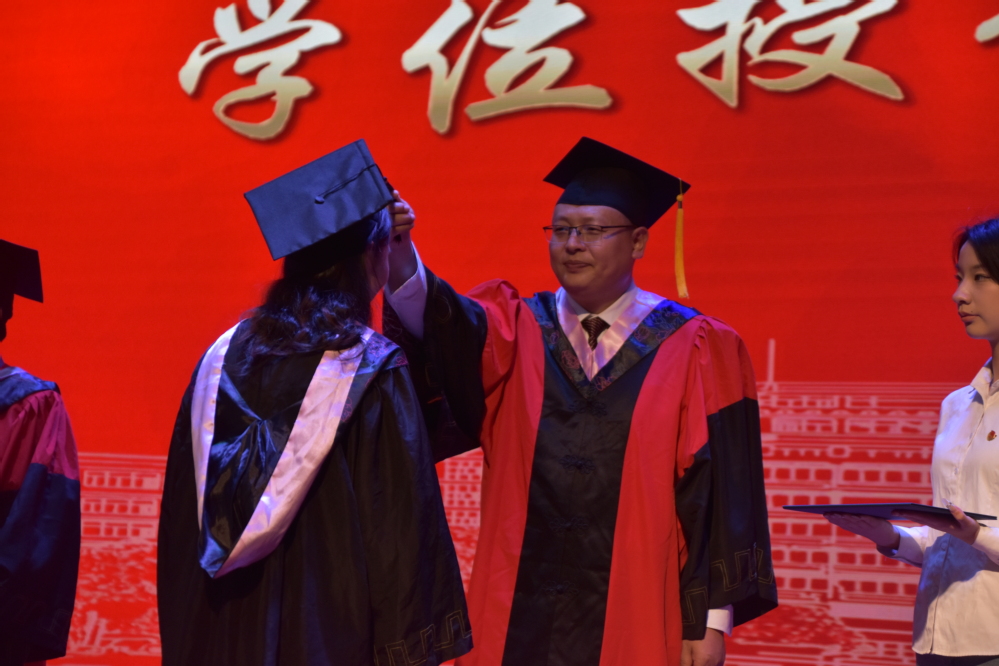 最后,激动人心的学位授予仪式开始,象征着毕业生们顺利完成学业,开启新的征程。毕业生们身着学士服依次走上台,由学位评定委员会成员为2024届毕业生正冠拨穗并合影留念。