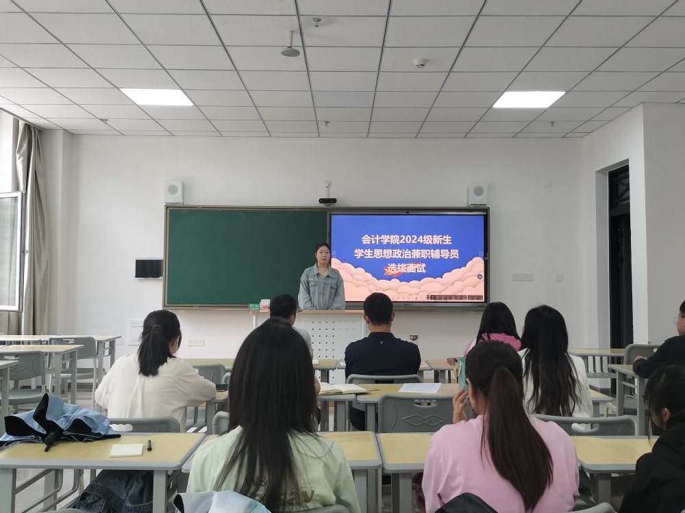 为进一步提高学生自主管理水平,不断充实学生教育管理的队伍,为优秀的学生党员提供实现自身价值的平台,帮助2024级新生更好地了解校园、适应环境,会计学院于9月4日在综合教学楼B111开展了2024级新生班学生辅导员选拔面试工作。学院党委书记姚建刚、行政院长何成洋、行政院长助理王亚超以及新生辅导员老师参加。