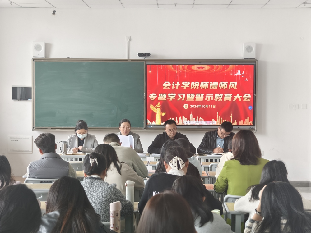 为深入学习贯彻习近平新时代中国特色社会主义思想、党的二十大、二十届三中全会精神及全国教育大会精神,全面提升教师队伍思想政治素质和师德师风水平,10月11日下午,会计学院组织召开了师德师风专题学习暨警示教育大会,学院党委委员、行政班子成员及全体教职工参加了会议,会议由学院党委书记姚建刚主持。