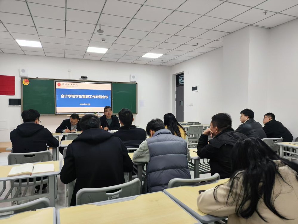 为了进一步加强学生日常管理工作,确保各项工作高效推进,会计学院于10月31日在综合楼A106办公室召开2024—2025学年第一学期学生管理工作会议(第四次)。学院党委书记姚建刚、院长助理王亚超以及全体辅导员参加本次会议,会议由行政院长何成洋主持。