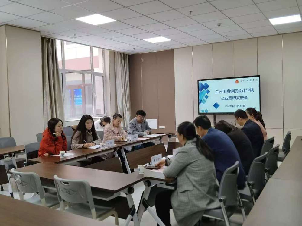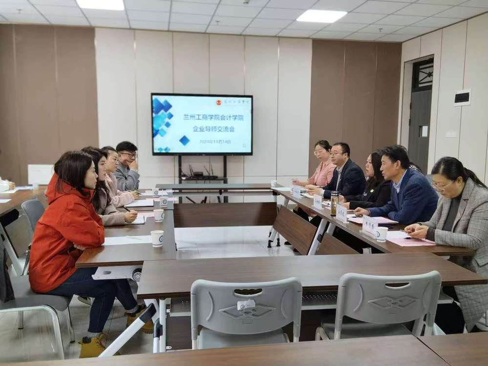 为进一步促进学校与企业的深度合作,会计学院于11月14日在综合教学楼A108举办校外导师座谈会。兰州投资(控股)集团有限公司甘肃合德人力资源服务有限公司总经理于桂存、兰州投资(控股)集团有限公司风控审计部部长贺文婷、兰州投资集团有限公司审计工作部风控专员张帆、兰州投资集团有限公司党委办公室副主任薛蕾、兰州工商学院助理校长周海燕、会计学院院长王学龙、党委书记姚建刚、教学院长李菊香出席本次交流座谈会。本次会议由会计学院行政院长助理王亚超主持。