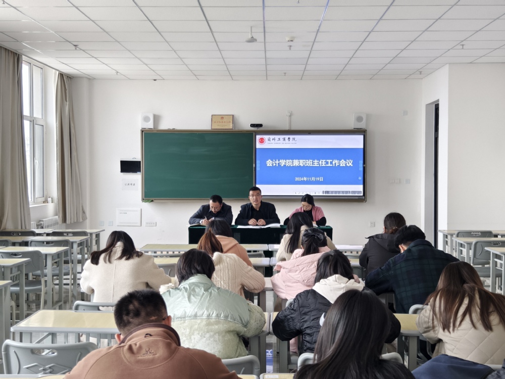 为贯彻落实《兰州工商学院兼职班主任工作实施办法(修订)》和《关于公布2024-2025学年兼职班主任匹配结果的通知》文件精神,加强学院学风建设,提高人才培养质量,促进学生全面发展,会计学院于11月19日下午在综合教学楼C207召开兼职班主任工作会议。会计学院行政院长何成洋、党委书记姚建刚以及全体兼职班主任参加了此次会议,会议由会计学院行政院长助理王亚超主持。