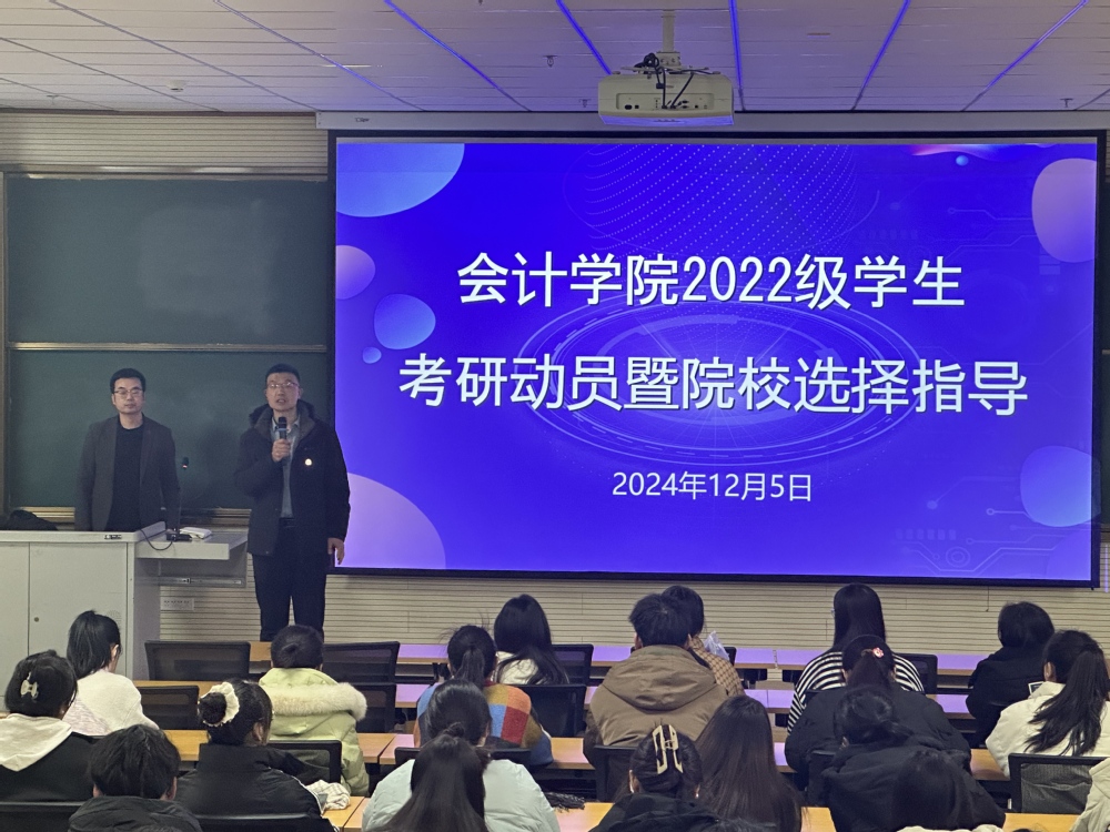 为加强学院学风建设,进一步调动2022级意向考研学生的备考积极性,引导学生了解考研政策,明确考研目标,会计学院联合乐学喵老吕考研兰州分校于12月5日在二号教学楼215教室和综合教学楼C503教室成功举办了两场2022级学生考研动员暨院校选择指导会,行政院长何成洋、2022级辅导员及意向考研学生参加此次会议,会议由行政院长助理王亚超主持。