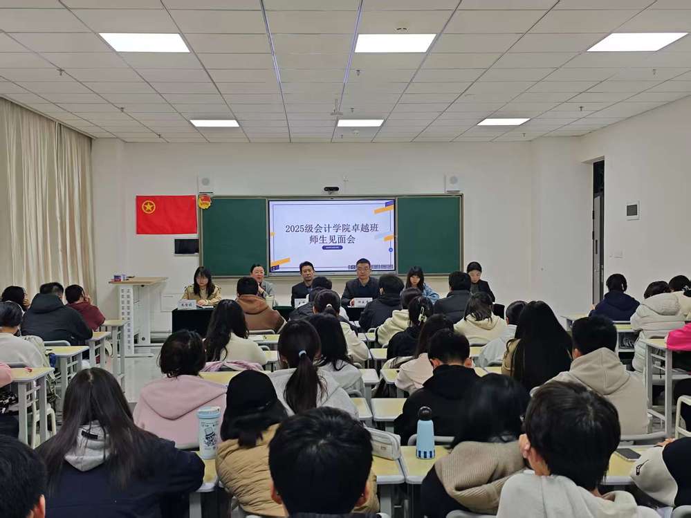 为搭建师生沟通桥梁、明确卓越班培养方向,助力2025级学子以清晰目标开启学业新程,10月16日下午,会计学院在综合教学楼A208教室组织召开了2025级卓越班师生见面会。会计学院院长王学龙,党委书记、行政院长何成洋,教学院长李菊香,教学副院长李菲,班主任米博娟及会计学(卓越班)2501、2502全体同学共同参会。会议由行政院长助理韦甜芳主持。