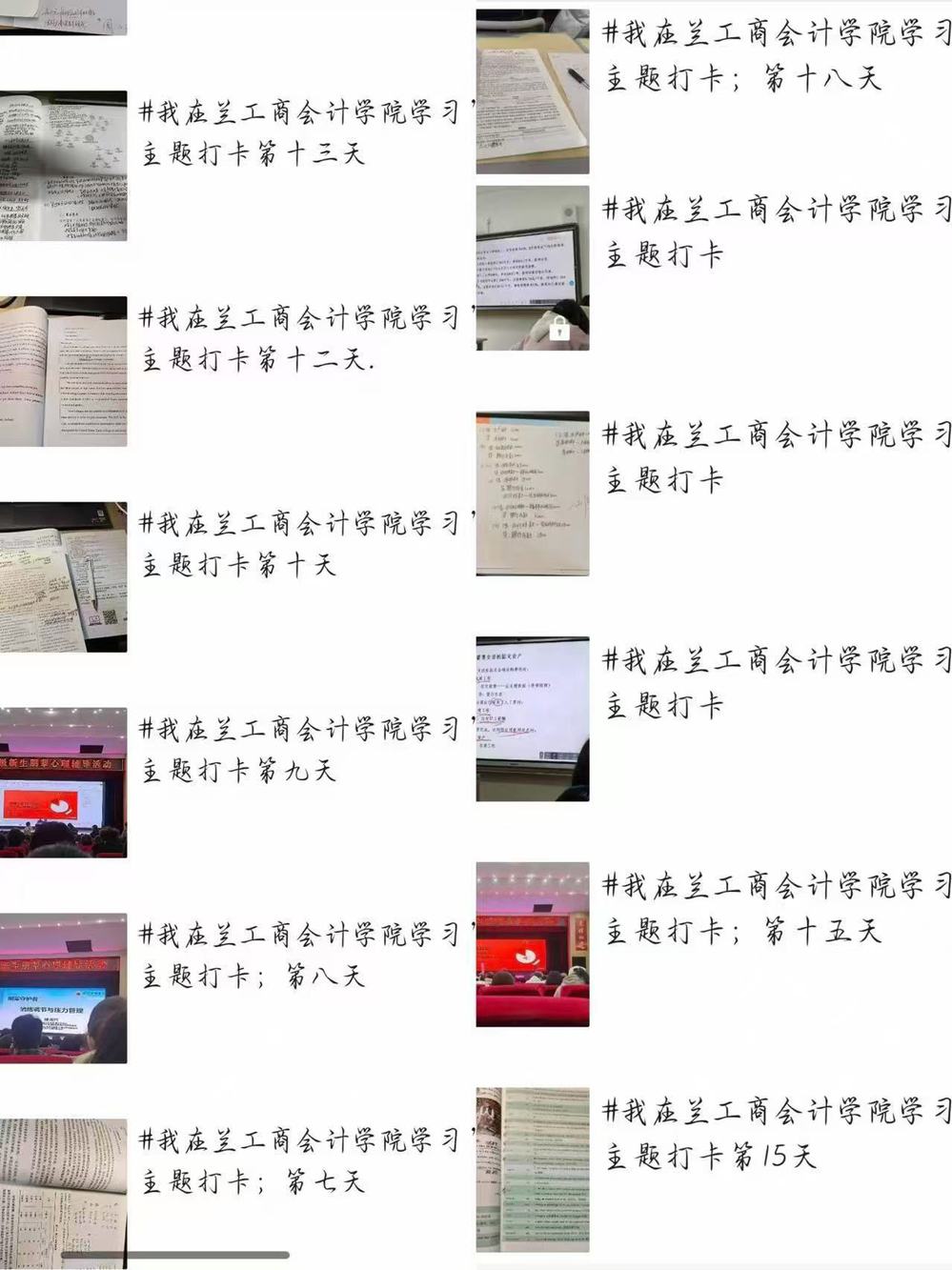 本次活动以“连续21天打卡”为核心机制,鼓励学生结合自身学习规划,每日完成专业复习、技能训练或课外阅读等任务,并在小红书、抖音、B站或朋友圈等平台中发布学习进展,附上“#我在兰工商会计学院学习”话题标签,以此实现学习过程的记录、分享与交流。