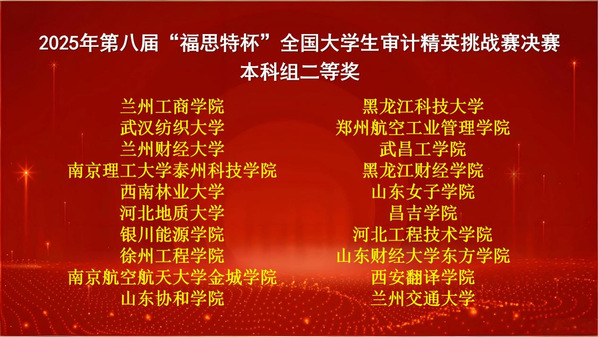 2025年11月29日,第八届“福思特杯”全国大学生审计精英挑战赛决赛在南京审计大学浦口校区圆满落幕。兰州工商学院会计学院由教师马调霞、石彩艳带领的肖喻心、李义、王璐3名学生组成的代表队凭借扎实的专业知识、出色的团队协作与稳定的现场发挥,最终荣获全国二等奖,展现了学校在审计人才培养方面的优秀成果和学子风采。