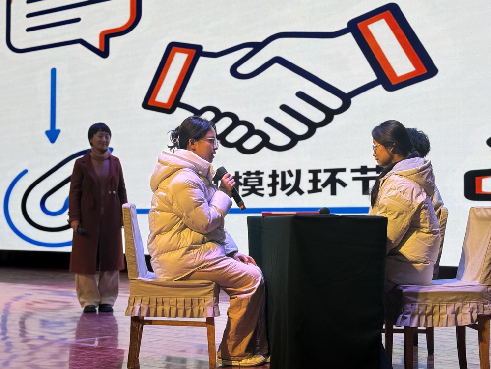 讲座围绕职场核心礼仪层层展开:以职场“社死瞬间”的真实案例破冰,让学子体悟礼仪价值;随后拆解求职面试“进门问好—递简历—坐姿—沟通—致谢”全流程,传授逻辑表达、限时应答技巧,明确多项避坑要点;同时覆盖职场沟通与日常办公礼仪核心,阐释“细节藏修养,礼仪定口碑”的箴言。互动环节中,参会学生积极配合主讲老师上台实践面试场景,胡老师针对性点评纠正,详解加分细节。期间,胡老师深情分享:“今天,分享一首诗给大家,‘白日不到处,青春恰自来。苔花如米小,亦学牡丹开。’有时,我们就像小小的苔花,但始终怀揣热忱、全力以赴,即使阳光未普照,也不黯然神伤;即使渺小如米,也有盛放勇气。我不需要谁做我的光,任何时候我都只愿做精彩的自己。”话语直抵人心,引发强烈共鸣。
