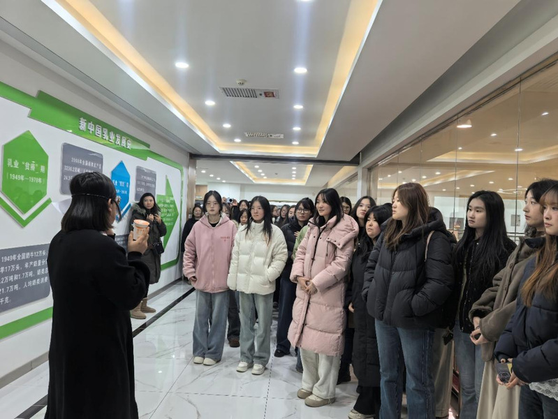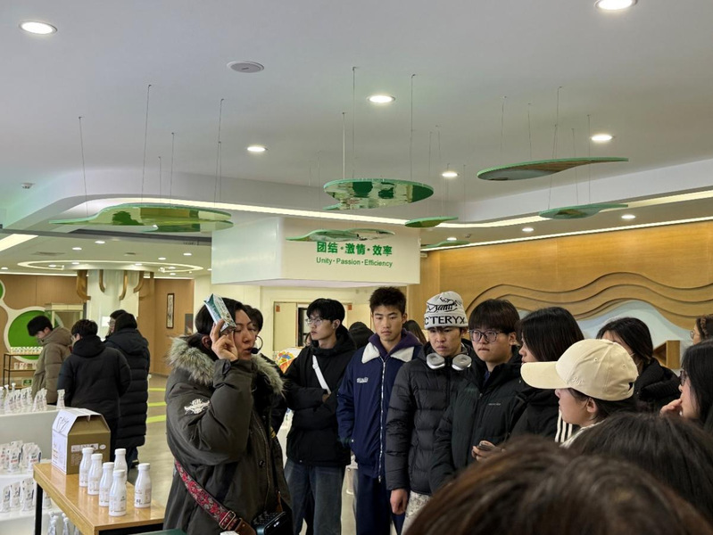 随后,同学们在厂区工作人员的引导下,有序参观了现代化的乳制品加工生产线。讲解员不仅向同学们科普了各类牛奶的营养区别、不同产品的保鲜技术与保质期设定,还深入浅出地介绍了巴氏杀菌工艺的关键作用。同学们亲眼看见了从原料奶验收、预处理、杀菌、灌装到包装的全自动化流程,对“工业4.0”背景下的生产效率和品控管理有了直观感受。参观过程中,工作人员还穿插介绍了庄园牧场的企业发展历程、品牌故事与企业文化,让同学们感受到一个现代化农业企业从扎根土地到驰骋市场的奋斗之路,理解了战略规划与成本管理在企业成长中的基石作用。