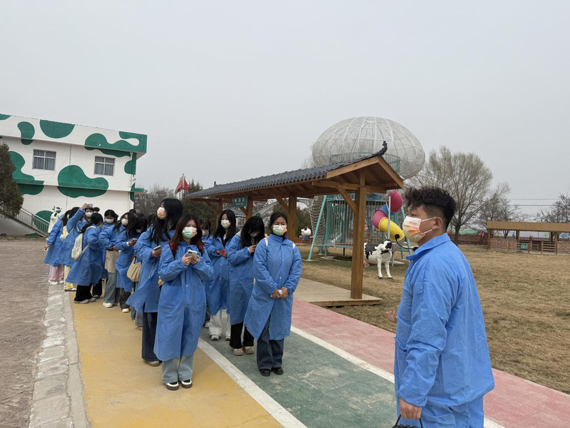 下午,师生们前往庄园牧场专属牧场,近距离参观了各类品种的奶牛,了解了奶牛养殖的标准化流程、饲养管理模式以及奶源品质管控要点。牧场内整洁的环境、科学的养殖方式让学生们开阔了视野,大家不时驻足观察、积极提问,脸上洋溢着浓厚的学习兴趣与喜悦之情,在轻松愉快的氛围中进一步完善对乳制品产业链上游环节的认知,也对企业“从牧场到餐桌” 的全链条质量管控理念有了更直观的理解。