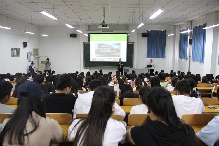 首先,Kal Benelhadj-Said在实验楼110教室为学院200余名学生做了宣讲,详细介绍了哈德斯菲尔德大学情况及入学要求、学习专业、费用等问题。讲座结束后,Kal Benelhadj-Said为有意向的七名学生现场进行了英语口试和笔试。本次语言测试通过的学生可直接被哈德斯菲尔德大学录取。
