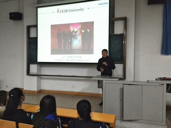 4月12日下午, 马来西亚UCSI大学国际市场部总经理Sean Calvin Yong应邀来我院进行访问,在实验楼110教室为我院200余名师生做了UCSI大学项目说明会。