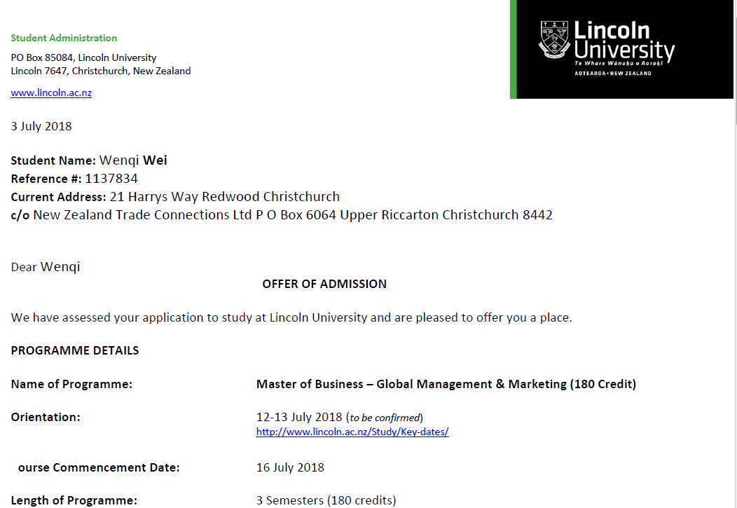近日,从陇桥学院“3+1+1”在校生联合培养项目合作院校之一的新西兰林肯大学传来消息,我院2014级会计系学生魏文琪已获得新西兰林肯大学研究生录取offer,将于2018年7月16日赴该校攻读管理学研究生。