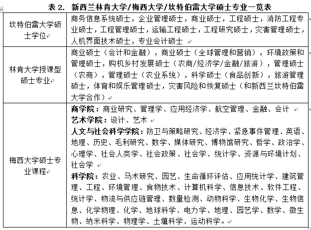 新西兰商学院、新西兰林肯大学(QS世界排名319位、五星大学)、新西兰坎特伯雷大学(QS世界排名214位、五星大学)、新西兰梅西大学(QS世界排名316位、五星大学)