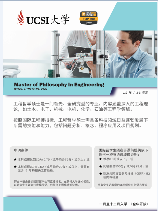 UCSI提供超过100项基础、文凭、学士以及硕士博士课程。硕士学位学制为1-2年,主要专业情况如下: