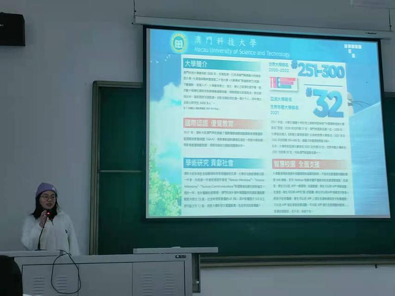 此次宣讲会正式开始前,为学生播放了澳门科技大学招生宣传片,后由科研与学术交流处处长马玉洁主持讲话,她告诉大家,学校为大家寻求新的考研路径,澳门科技大学硕士申请考核制项目,澳门科技大学排名靠前,综合实力强,位于经济发达区域,不仅开阔学生的眼界,而且毕业后就业机会多。