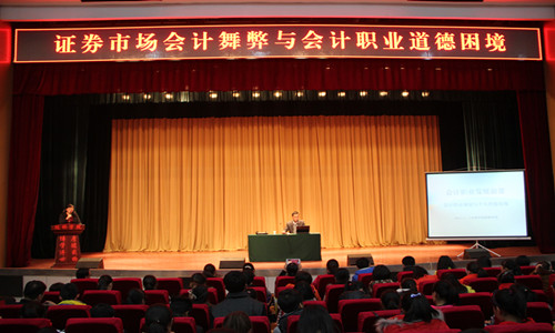 2014年11月12日,名家讲坛第五十讲在我院学术报告厅举行,著名注册会计师、英国皇家特许会计师、澳洲注册会计师、财政部会计行业领军人才李宗义先生应邀为师生做了题为《证券市场会计舞弊与会计职业道德困境》的精彩讲座。讲座由会计学系主任李菊香主持,我院师生共800多人参加了讲座。