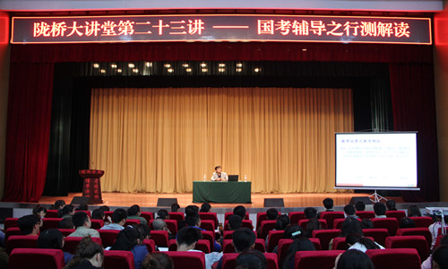 2014年10月22日下午,陇桥学院“陇桥大讲堂”第二十三讲在学术报告厅举行,华图教育资深讲师岳升老师面向全院师生作了题为国考辅导之行测解读的大学生国考辅导专题讲座,全院师生共800余人参加了讲座。