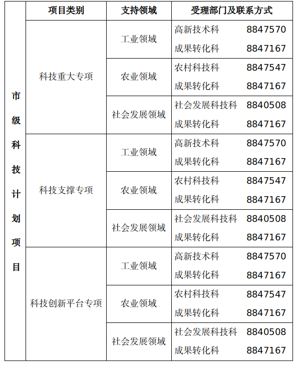 2024年度市级科技计划项目包括科技重大专项、科技创新平台专项、科技支撑专项三类:
