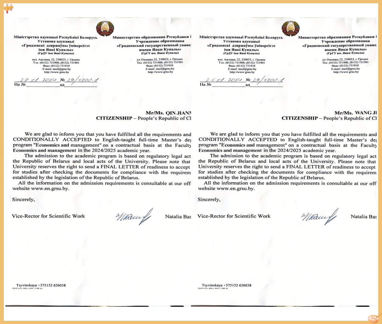 近日,从白俄罗斯格洛德诺国立大学传来喜讯,我校学生王婧、秦建民分别获得白俄罗斯格洛德诺国立大学经济管理硕士研究生offer,将于明年赴该校攻读硕士研究生学位。