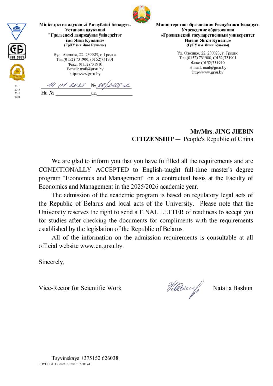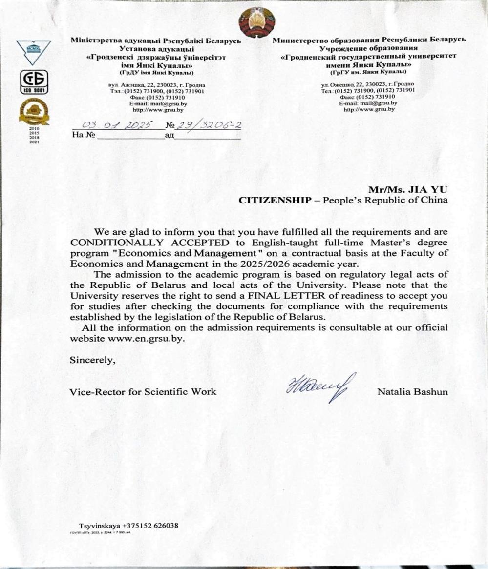 我校4名学生成功获得海外高校研究生offer,其中 1名同学被英国约克大学录取,3 名同学被白俄罗斯格罗德诺州立大学录取。他们凭借扎实的专业知识、出色的综合素质和不懈的努力,在众多申请者中脱颖而出,获得了世界知名学府的青睐。