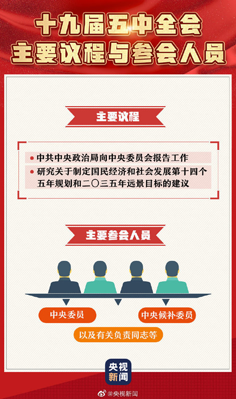 中国共产党第十九届中央委员会第五次全体会议,于10月26日至29日在北京举行。主要议程是,中共中央政治局向中央委员会报告工作,研究关于制定国民经济和社会发展第十四个五年规划和二〇三五年远景目标的建议。今天,一组图带你了解十九届五中全会。