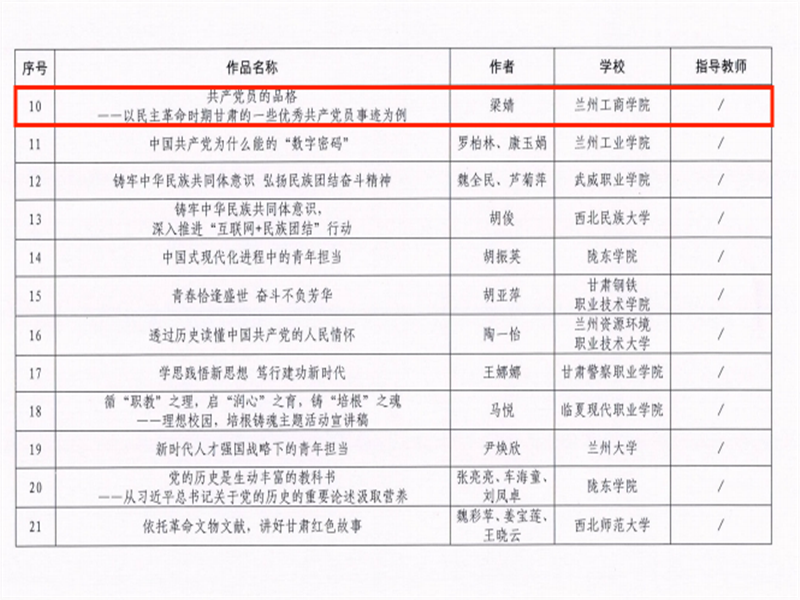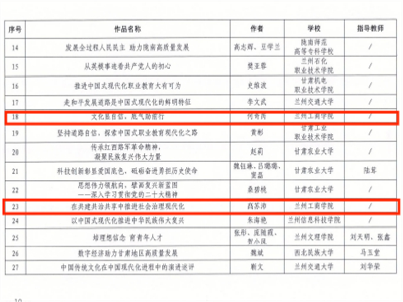 为深入学习贯彻习近平新时代中国特色社会主义思想和党的二十大精神,坚持不懈用党的创新理论铸魂育人,打造富有甘肃教育特色的宣讲品牌,在省委宣传部、省委教育工委、团省委联合组织举办的“理响校园·培根铸魂”全省高校理论宣讲作品征集评选展示活动中,我校马克思主义学院精心组织,在此次作品征集评选活动展示取得佳绩,荣获甘肃省高校理论宣传作品三个奖项。