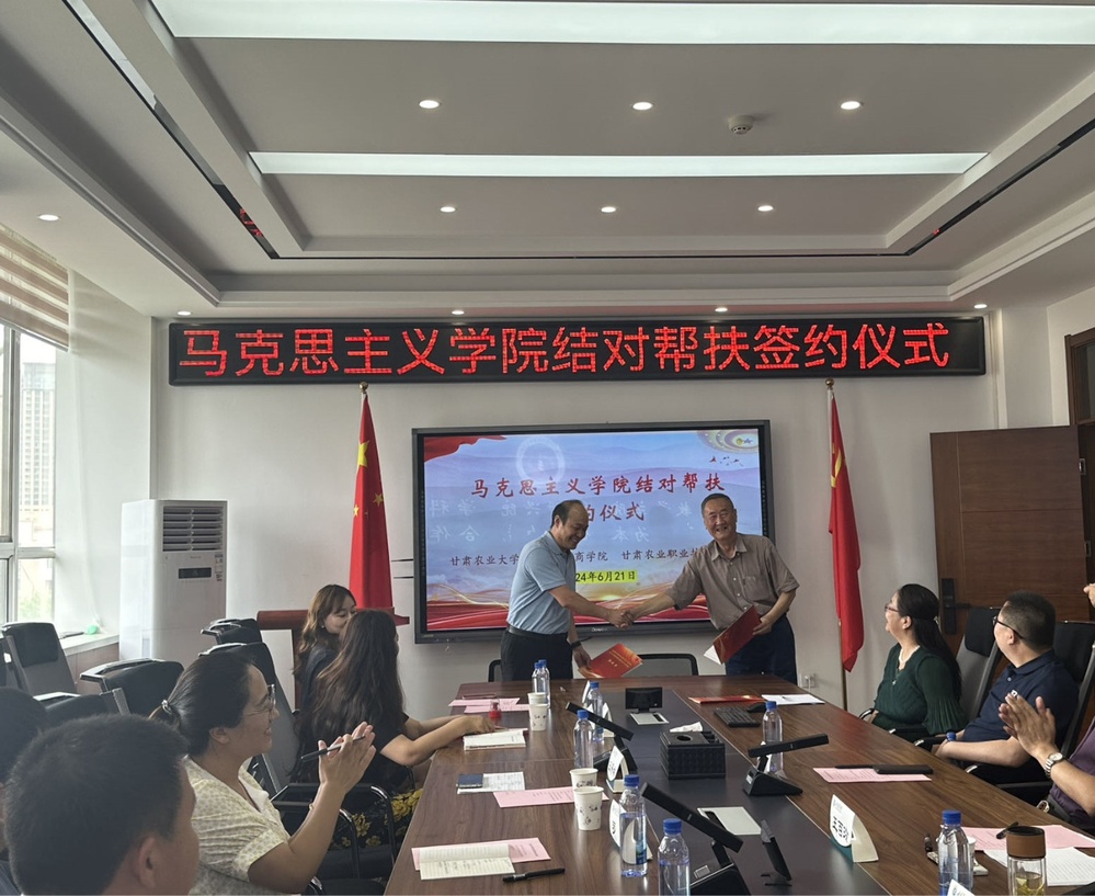 为了进一步推进我院思政课程建设、学科团队建设、合作交流等工作落实落细。6月21日,马院院长王晋林等一行四人前往甘肃农业大学马院,参加马克思主义学院结对帮扶签约仪式。甘肃农业大学党委宣传部常务副部长王百玲、马克思主义学院党委书记闫翔、院长侯庆丰及相关教研室负责人出席了签约座谈会。会上,侯庆丰院长介绍了甘农大马院的基本情况、学科特色、思政课建设情况、招生就业情况和对外合作交流等情况。