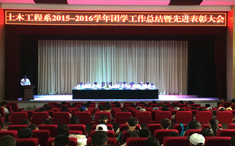 为进一步发扬共青团的优良传统,增强广大团员青年肩负历史使命的责任感和时代感,激励广大团员青年以更加饱满的政治热情和务实勤奋的学习态度积极投入到学风建设和学生日常行为习惯养成教育中来,充分发挥先进学生干部的先锋模范作用,事事处处起表率、时时刻刻做模范。在全院纪念“五四”运动之际,土木工程系于7月6日下午在学术报告厅隆重举行2015-2016学年团学工作总结暨先进表彰大会。土木工程系主任曹凯,系党总支书记尚飞,工程管理教研室主任王顺利,土木工程教研室主任马龙应邀出席了会议。土木工程系全体辅导员、团总支学生分会主席团成员、2015级学生思想政治辅导员参加了大会并在主席台就坐,全系500余名团员青年参加了会议。大会由土木工程系党政秘书祁海云主持。
