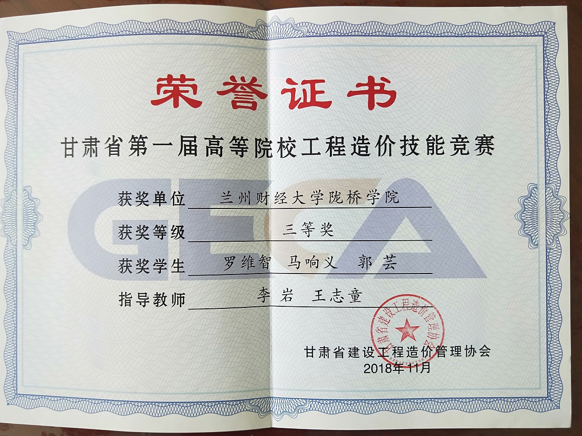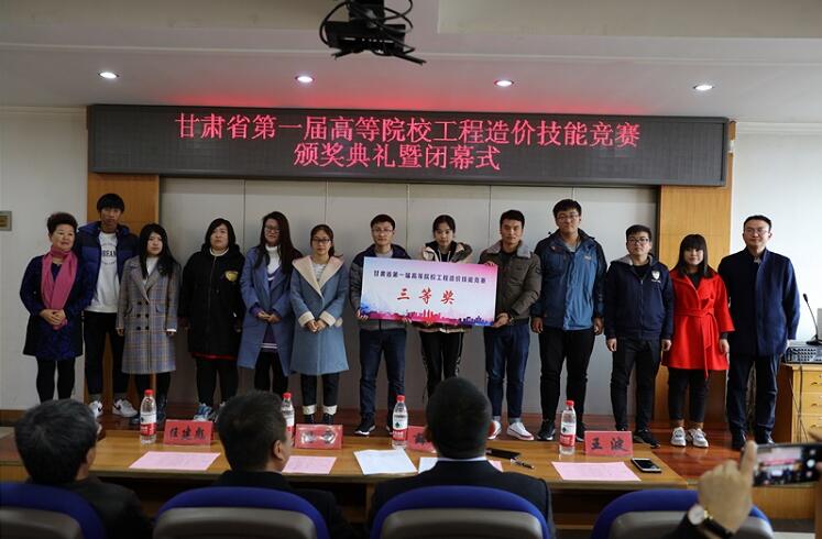 2018年11月4日,由甘肃省建设工程造价管理协会主办,甘肃省建设工程造价管理总站指导,甘肃建筑职业技术学院承办的甘肃省第一届高等院校工程造价技能竞赛在甘肃建筑职业技术学院胜利闭幕。在本次比赛中,由我院土木工程系王志童、李岩、王婷三位教师及6名同学组成的三支代表队参加了比赛。参赛队员在缺乏大赛经验的情况下,克服重重困难,经过激烈的比赛角逐,有2支参赛队最终获得本科组三等奖。