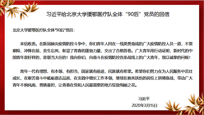 尚书记通过《习近平在给北京大学援鄂医疗队全体‘90后’党员的回信》拉开了整场主题教育班会的序幕。尚书记在班会上,带领同学们学习了习近平总书记的回信精神,激励同学们要勇挑重担,为打赢疫情防控阻击战贡献自己的力量,让青春在党和人民最需要的地方绽放绚丽之花;重温了以习近平同志为核心的党中央对青年一代成长成才的关心、期望和寄语,寄语青年“既要仰望星空,也要脚踏实地,把学习的具体目标同民族复兴的宏大目标结合起来,为之而奋斗。”