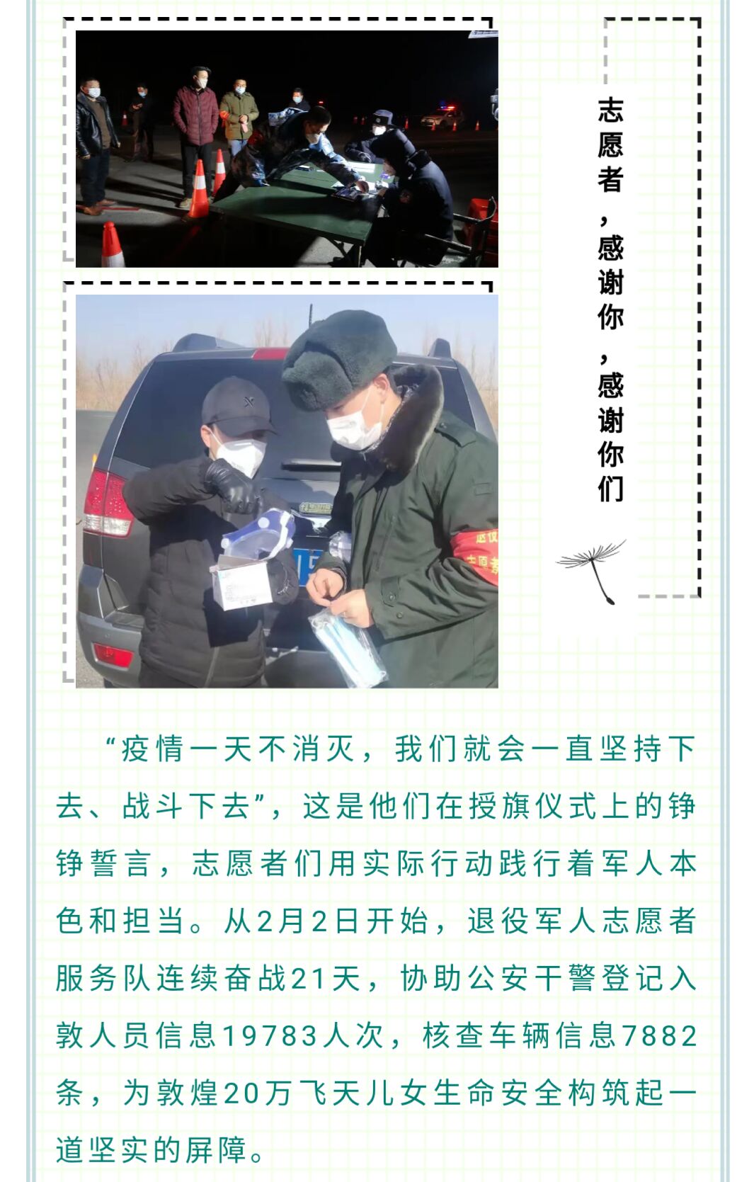 在此次抗疫活动中,在全体一线工作人员和志愿者的不懈坚守和长期奋战下,有效的阻断了病毒传播,取得了敦煌境内无一例新冠肺炎确诊病例的佳绩,甘吉鹏同学在疫情防控工作中表现积极,得到了带队干部、公安部门的肯定和表扬,酒泉军分区将其参加抗疫活动的事迹发至军分区政工网。