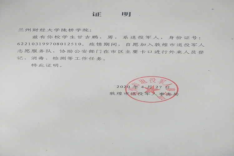 在此次抗疫活动中,在全体一线工作人员和志愿者的不懈坚守和长期奋战下,有效的阻断了病毒传播,取得了敦煌境内无一例新冠肺炎确诊病例的佳绩,甘吉鹏同学在疫情防控工作中表现积极,得到了带队干部、公安部门的肯定和表扬,酒泉军分区将其参加抗疫活动的事迹发至军分区政工网。