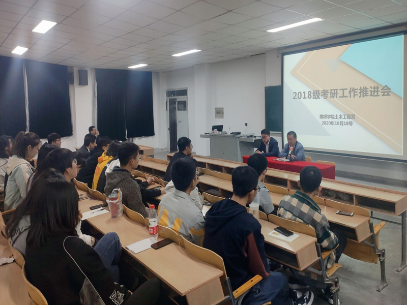 为全面推动2018级学生考研工作,根据学院考研工作整体安排和部署,9月24日土木工程系领导班子组织2018级全体学生分两个场次在2号教学楼315教室召开了2018级学生考研动员推进会,会上系领导分别从考研形势、升学深造趋势、专业优势和学院考研政策支持等方面对同学们做了全面系统的分析和介绍,动员同学们尽早制定备考计划,开启备考之路。