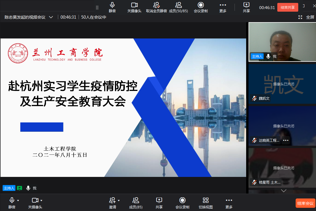 根据甘肃省教育厅疫情防控视频会议精神和学校工作安排,为保障我院在外实习实训学生的疫情防控安全,土木工程学院于8月15日晚9点通过钉钉视频召开了赴杭州实习学生疫情防控及生产安全教育大会。学院党总支副书记陈志昊、毕业班辅导员刘辉以及赴杭州实习的全体学生参加了视频会议。会议由刘辉主持。