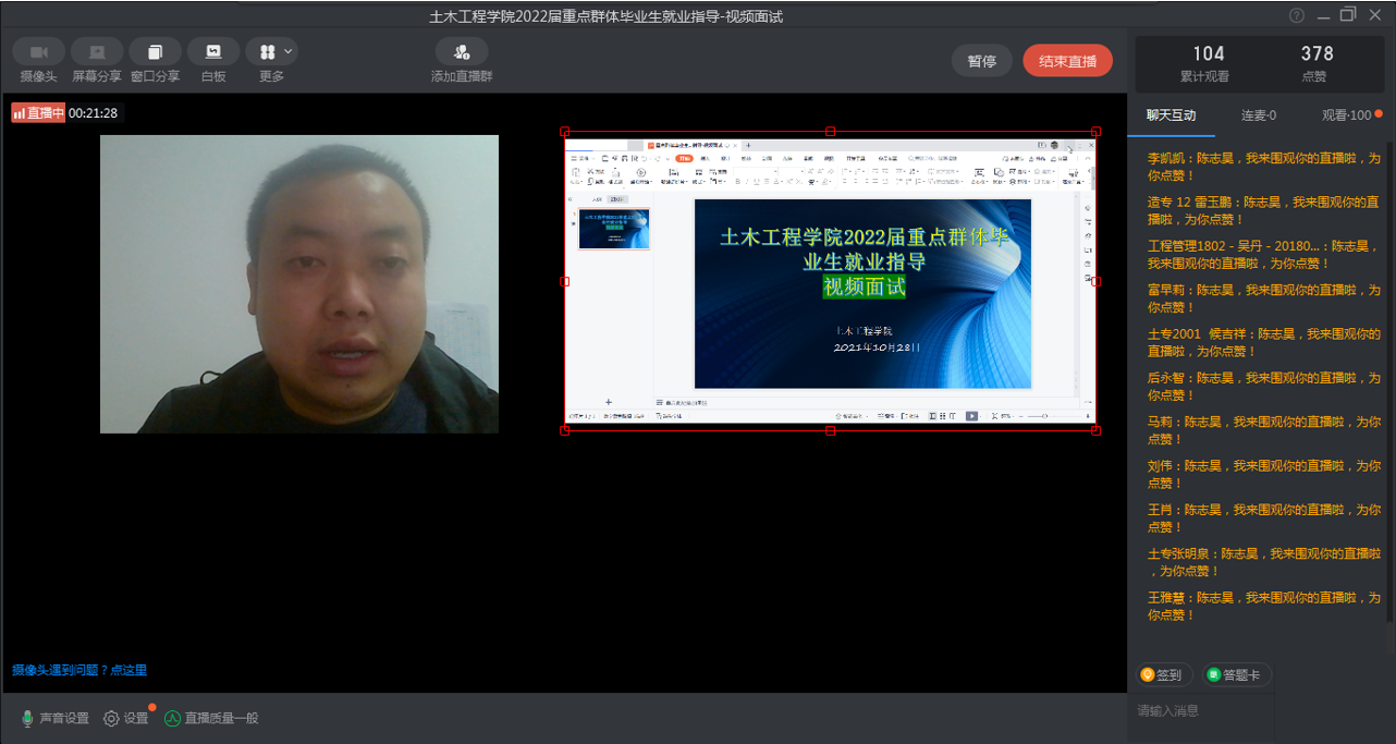 根据学校重点工作推进安排,为有效帮助重点群体毕业生提升就业竞争力,顺利实现高质量就业,10月28日晚上8:30,土木工程学院通过线上召开2022届重点群体毕业生就业培训会,结合疫情防控形势,本期培训内容选题为视频面试,全院一百余名重点群体毕业生参加了培训,本次培训由学院党总支副书记陈志昊主讲,毕业班辅导员李剑、刘辉补充强调。