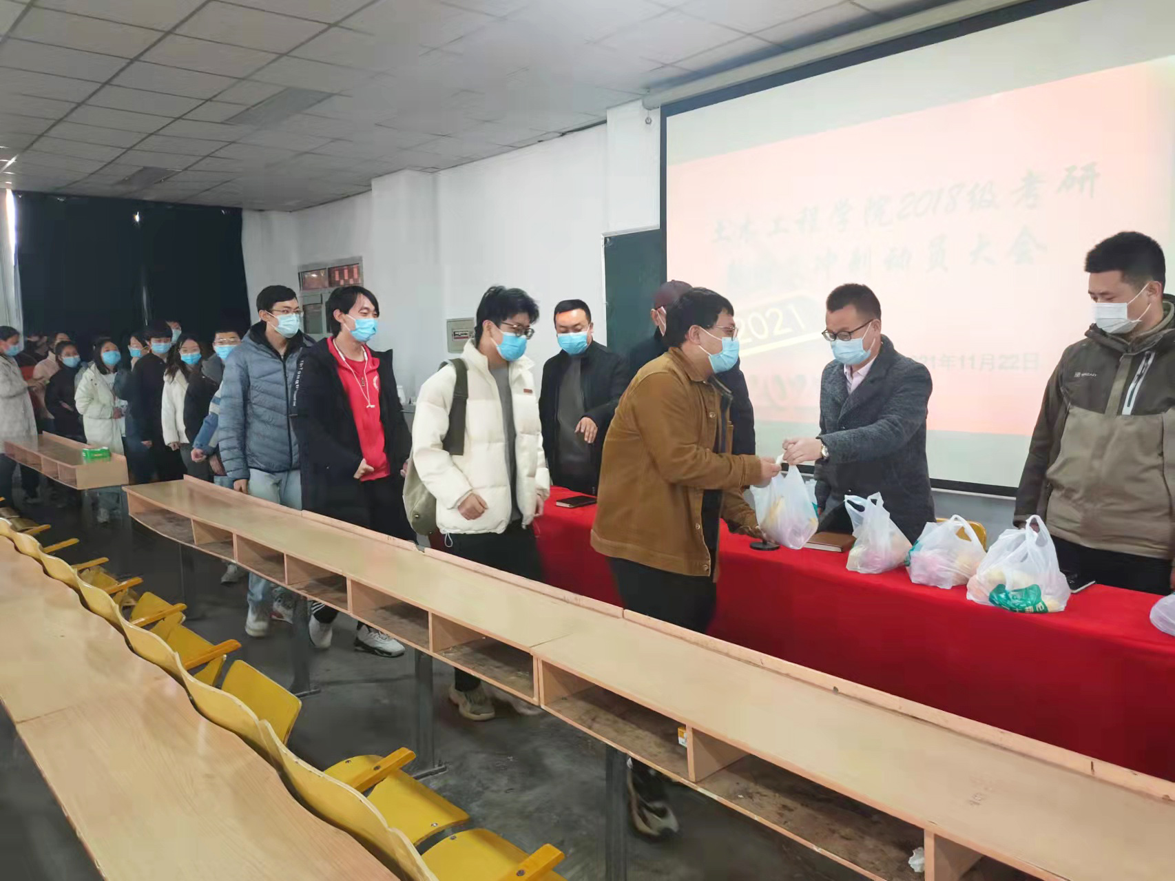 随后,参会领导对学院的调休安排和慰问决定予以通知,鼓励同学们做好调整,切忌疲劳战,以饱满的精神状态投入到学习中,在现场热烈的欢呼声中,与会的领导和老师为现场的同学们发放了考研慰问品。