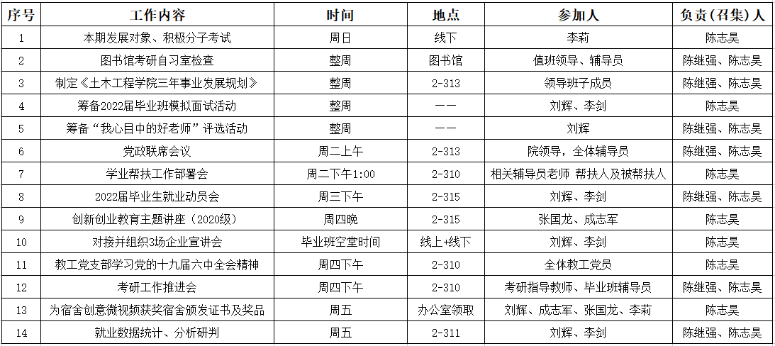 土木工程学院2021-2022学年第1学期第13周工作安排
