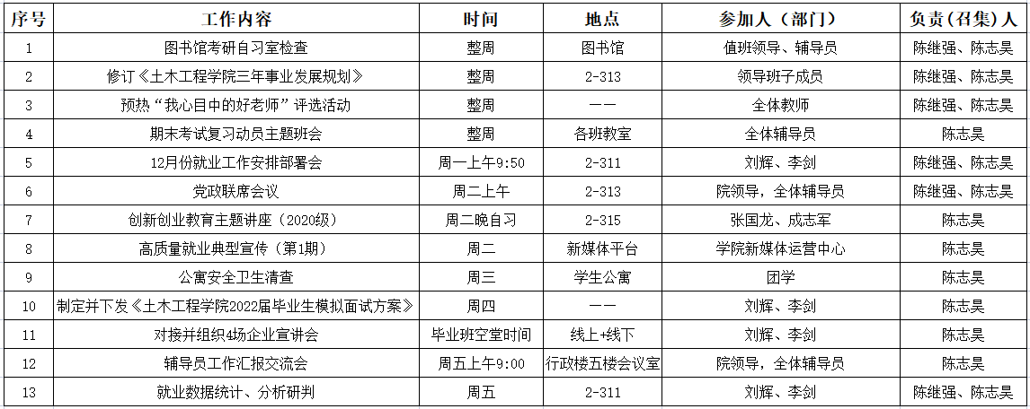 土木工程学院2021-2022学年第1学期第14周工作安排