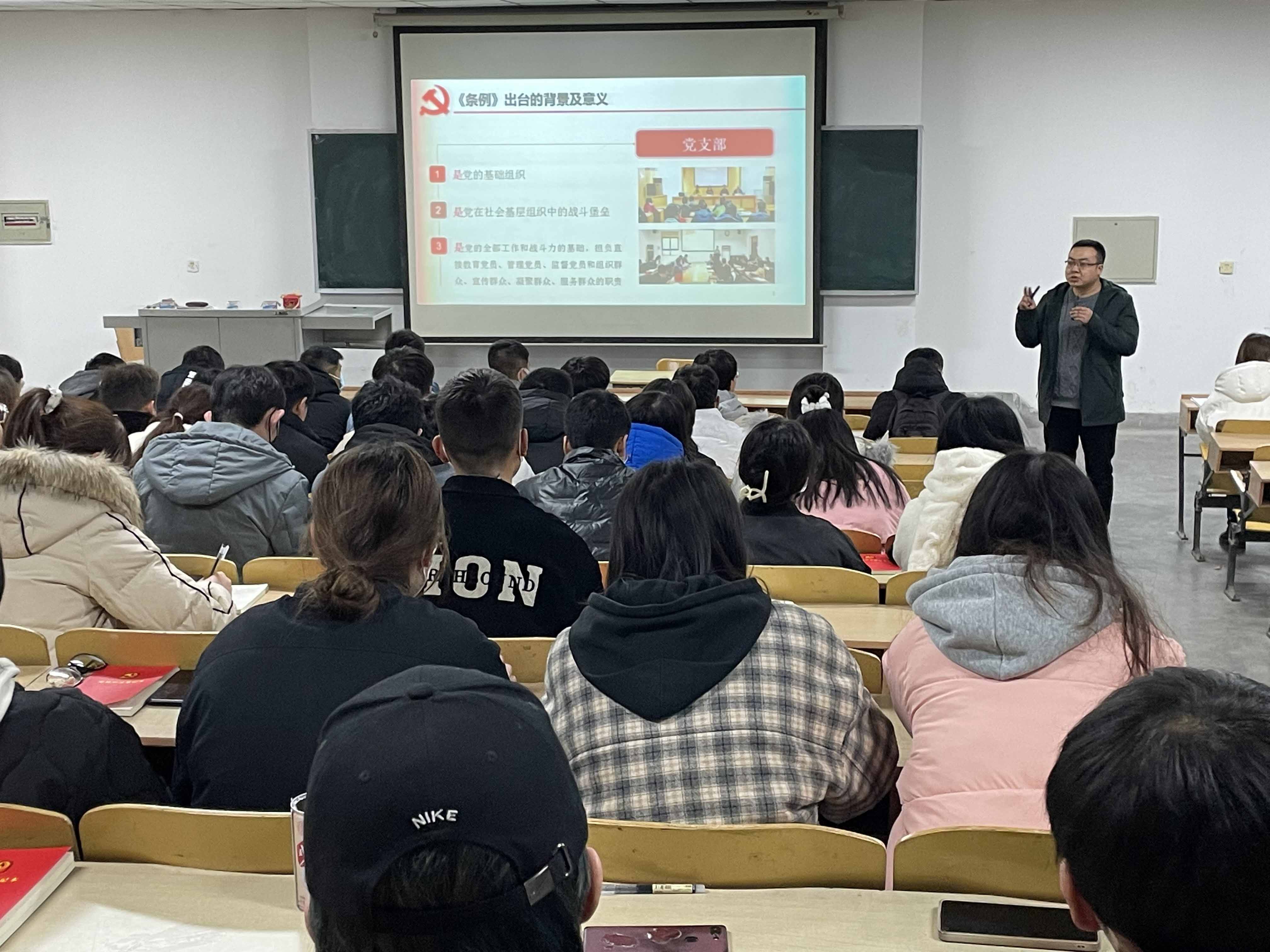 会上,陈书记结合党的十九届六中全会中关于加强党的建设相关内容,为同学们做了《中国共产党支部工作条例(试行)》解读的辅导报告,他结合学生党支部建设过程中存在的问题,对党支部标准化建设提出几点要求:一、严格执行《条例》各项要求和规定,积极开展“三会一课”和主题党日、组织生活会、民主评议党员、谈心谈话等各项组织生活,开展“对标争先”建设,充分发挥党支部作用,努力把党支部建设成为推动学校高质量发展的坚强战斗堡垒。二、加强对党员的党性培养教育;三、充分发挥党员在为民办实事过程中的先锋模范带头作用,对学业困难、就业困难、生活困难等社会普遍关注的问题制定切实可行的工作计划,开展系列帮扶活动,提高党员的奉献意识和责任意识。