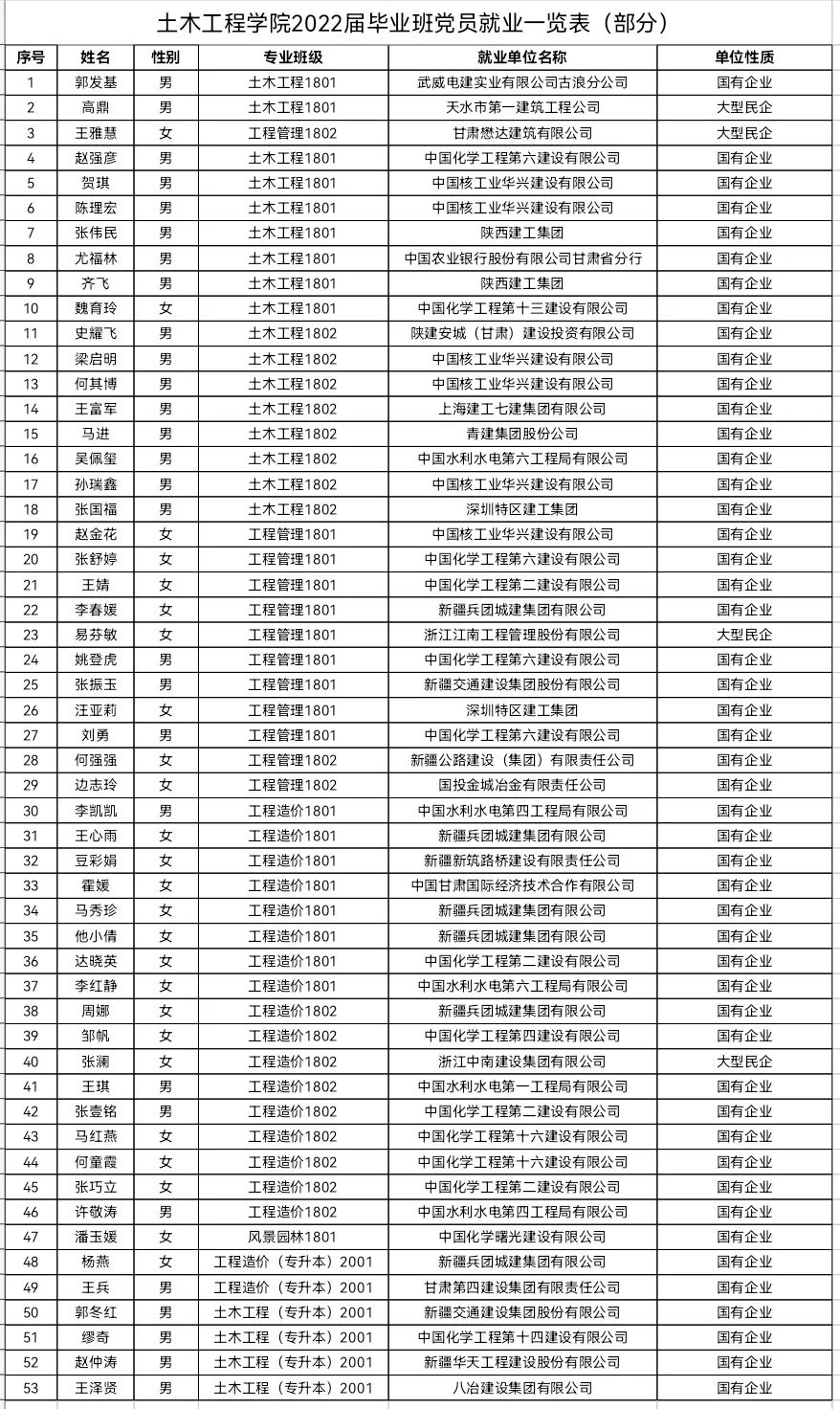 2022届毕业生党员共计97人,截止目前已落实毕业去向83人,其中签约就业75人,参加研究生复试15人(目前拟录取8人),高质量就业共61人,占比达到73.5%;党务学生干部共9人,全部落实毕业去向,其中签约就业7人,考研拟录取2人,高质量就业7人。