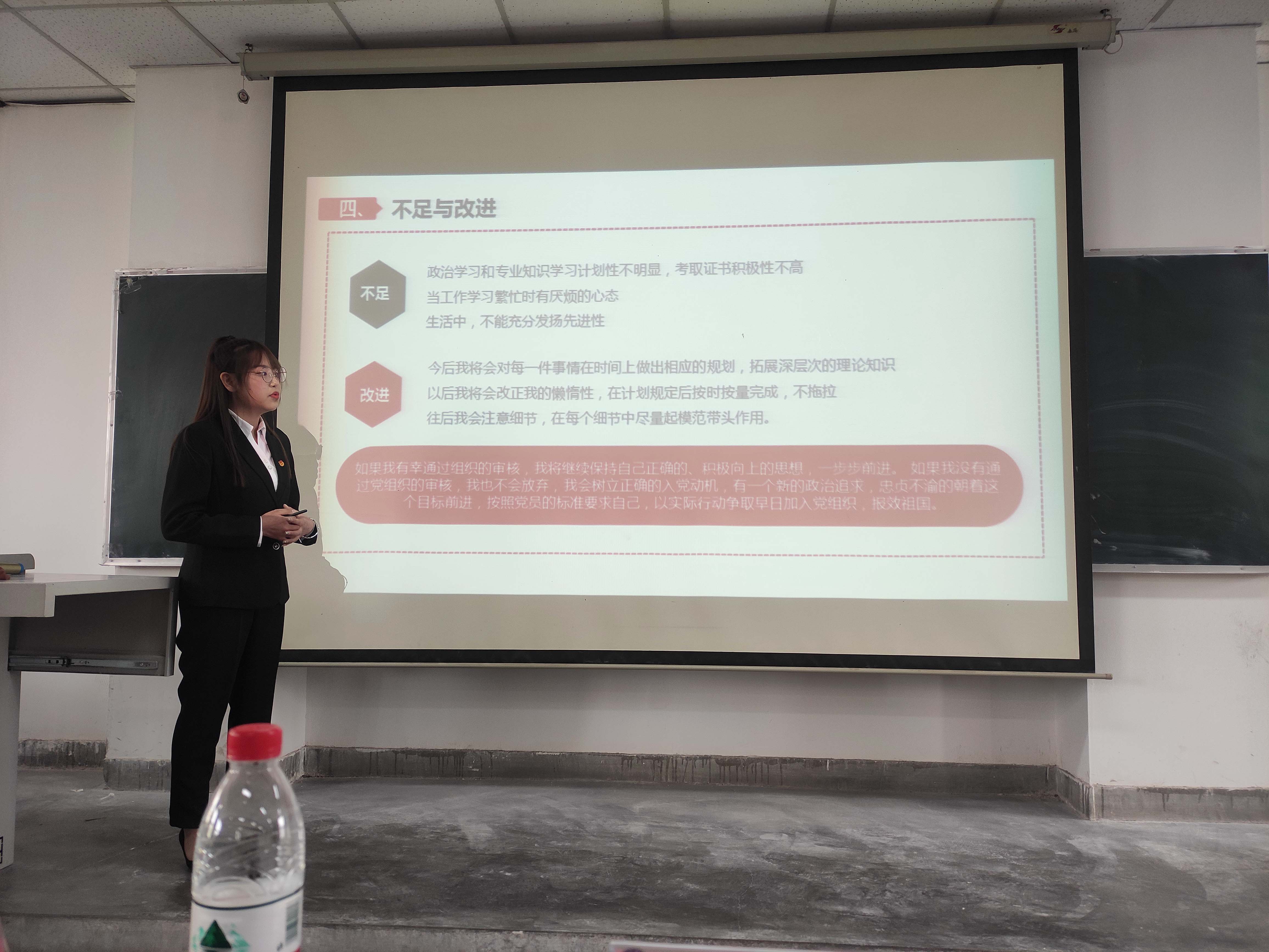 接着,参加答辩的同学依次上台采用PPT形式答辩。同学们首先进行了自我介绍,包括个人对党的认识过程、入党动机、现实表现、参加实践活动、主要优缺点及对个人大学期间的规划等。