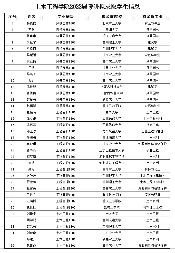 随着2022年全国硕士研究生招录考试工作结束,土木工程学院2022年考研工作最终尘埃落定,再上新的台阶。2022届毕业生中共有137名同学参加了全国硕士研究生招录考试,在国家线大幅上涨的情况下,土木工程学院共有49人上线,经过复试考核,最终有36名同学被北京林业大学、贵州大学、青海大学、宁波大学、西南林业大学、重庆交通大学等22所省内外院校顺利录取,考研上线率达到35.8%,录取率达到26.3%,录取人数较2021年增加8人,占比达到学院本科毕业生总数的10.7%,整体录取率上涨1.4个百分点;尤其是风景园林专业创下了22人参加考试,19人上线,14人被录取的佳绩,录取率达到41.2%。