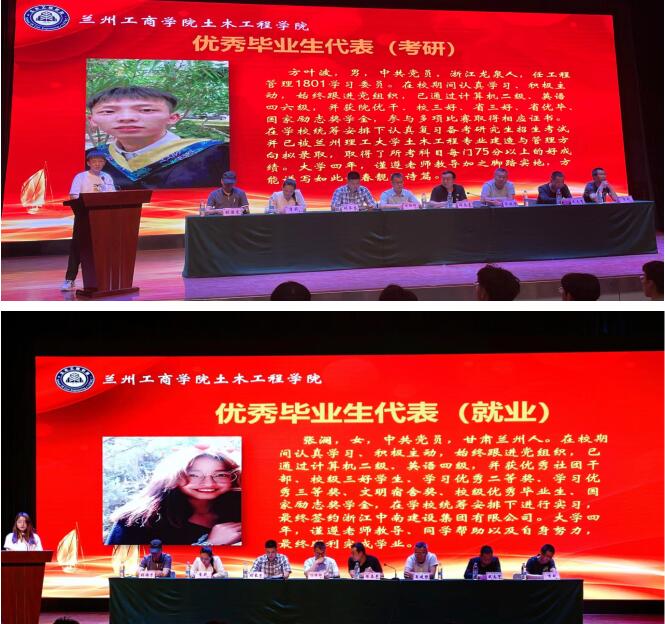会上,三名优秀毕业生代表做主旨发言,他们代表全体毕业生向辛勤培养自己的母校和学院领导老师表示衷心的感谢,其中方叶波同学结合考研备考过程、张澜和刘星天两名同学结合求职就业过程,向在场同学做考研和就业经验分享,他们鼓励学弟学妹们要做好大学人生规划,脚踏实地,延续和传承好“自强不息,艰苦奋斗,持之以恒,永不言弃”的土木精神。签约中国能源建设集团东北电力第三工程有限公司的刘星天同学代表2022届全体同学,向大家保证,在到达工作岗位以后,一定恪尽职守,努力成长,将土木精神继续发扬光大,争取为学弟学妹们创造更多的高质量就业机会。